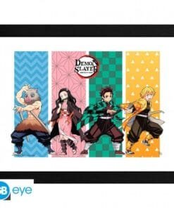 Ramenez quatre de vos personnages préférés de la série phénomène Demon Slayer chez vous avec ce tirage encadré de groupe par ABYstyle. Il représente Tanjiro, Nezuko, Zenitsu et Inosuke avec leurs motifs signatures, accentués par un cadre noir.