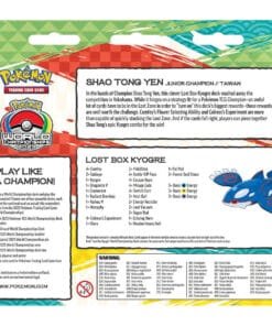 Ce produit est plus qu’une simple collection de cartes ; c’est un outil d’apprentissage et de compétition. Vous recevez un deck complet, identique à celui utilisé par Shao Tong Yen lors de l’événement. Le deck Kyogre Lost Box utilise une synergie puissante pour accélérer le jeu et infliger des dégâts massifs. Préparez-vous à défier vos adversaires avec l’une des stratégies les plus mémorables de l’année 2023 ! C’est le moyen parfait de vous familiariser avec le haut niveau de jeu compétitif du Pokémon Trading Card Game.